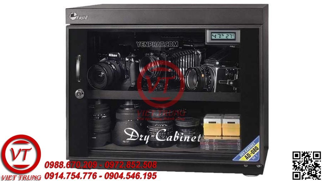 - Tủ chống ẩm Fujie AD080(VT-CA83) đồng hồ kỹ thuật số báo độ ẩm/nhiệt độ và có nút điều chỉnh độ ẩm ở bên trong.